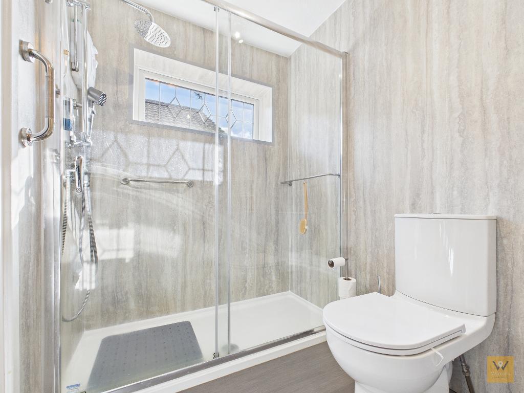 7' 10'' x 5' 4'' (2.41m x 1.65m) Walk-in shower with electric shower and dual shower head. Laminate wet wall. Low level wc and wash basin. Radiator and towel heater. Vinyl flooring. Double glazed window to the side elevation.