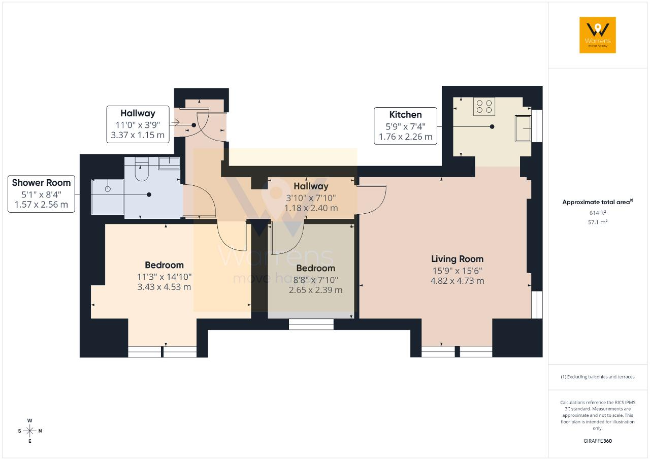 5' 1'' x 8' 4'' (1.57m x 2.56m) A sleek shower room, finished in chic greys set against crisp white walls and a modern suite, completes the interior. The suite comprises a tiled shower cubicle, a low level w.c. and a wash hand basin housed in vanity unit. Heated towel rail. Tiled floor.