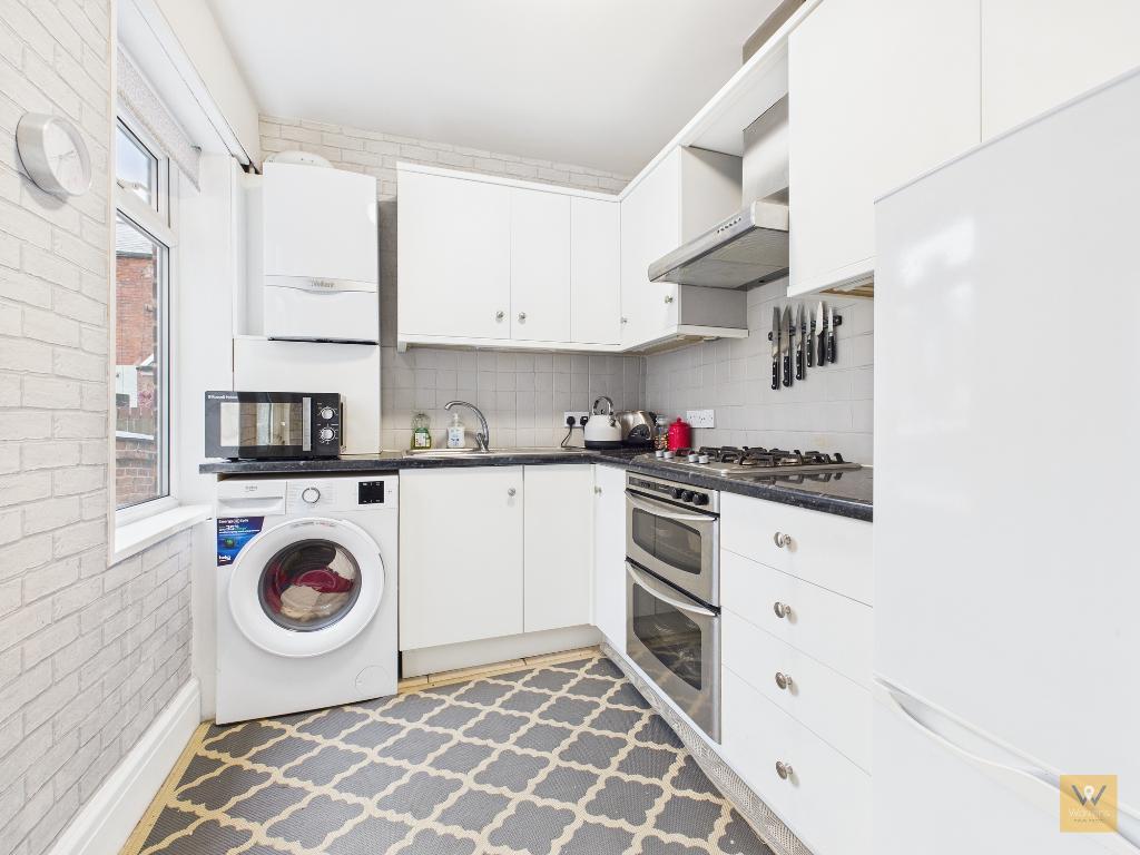 8' 7'' x 6' 10'' (2.62m x 2.11m) Fitted with a range of wall, drawer and base units with under unit lighting. Work surfaces incorporate a stainless steel sink and drainer. Integrated double oven with gas hob and extractor hood over. Spaces for a fridge freezer and washing machine. Tiled flooring and part tiled walls. Wall mounted 'combi' boiler. Double glazed window and door leading out to the rear garden.