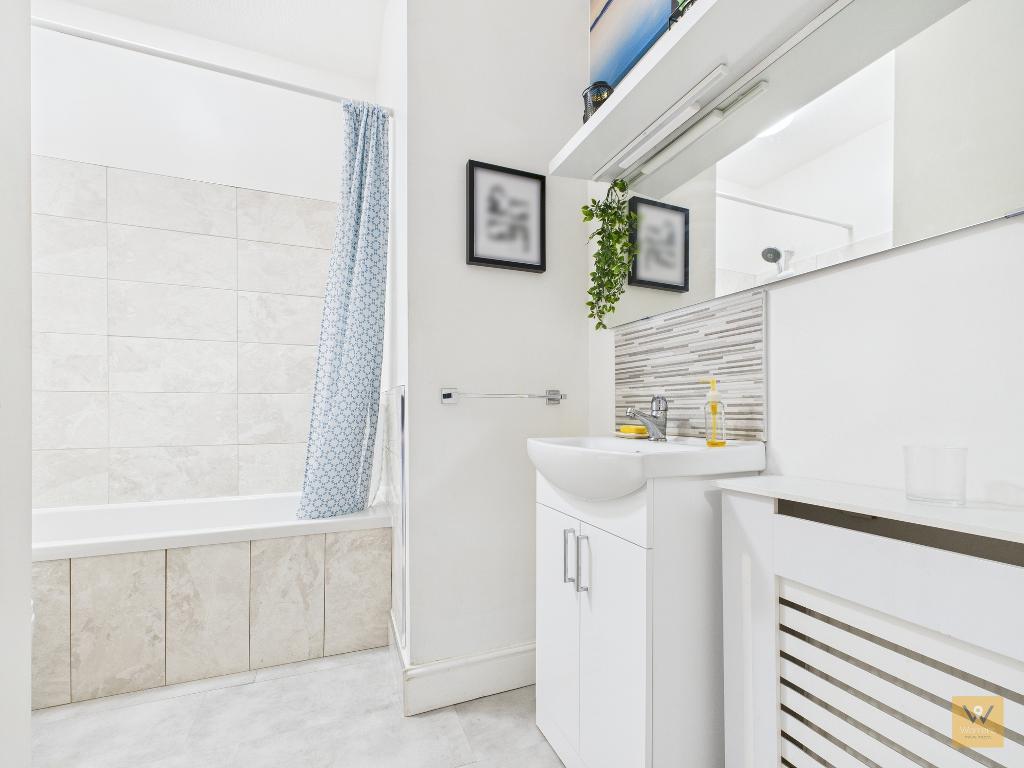 7' 7'' x 8' 5'' (2.33m x 2.58m) An 'L' shaped bathroom finished in a contemporary style with light grey tiling off set by white decor and the modern white 3 piece suite comprising a panelled bath (with a shower over), a wash hand basin (housed in a vanity unit) and a low level w.c.