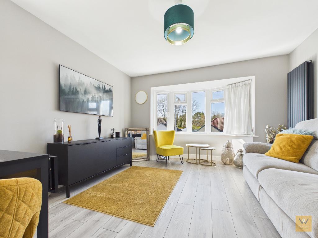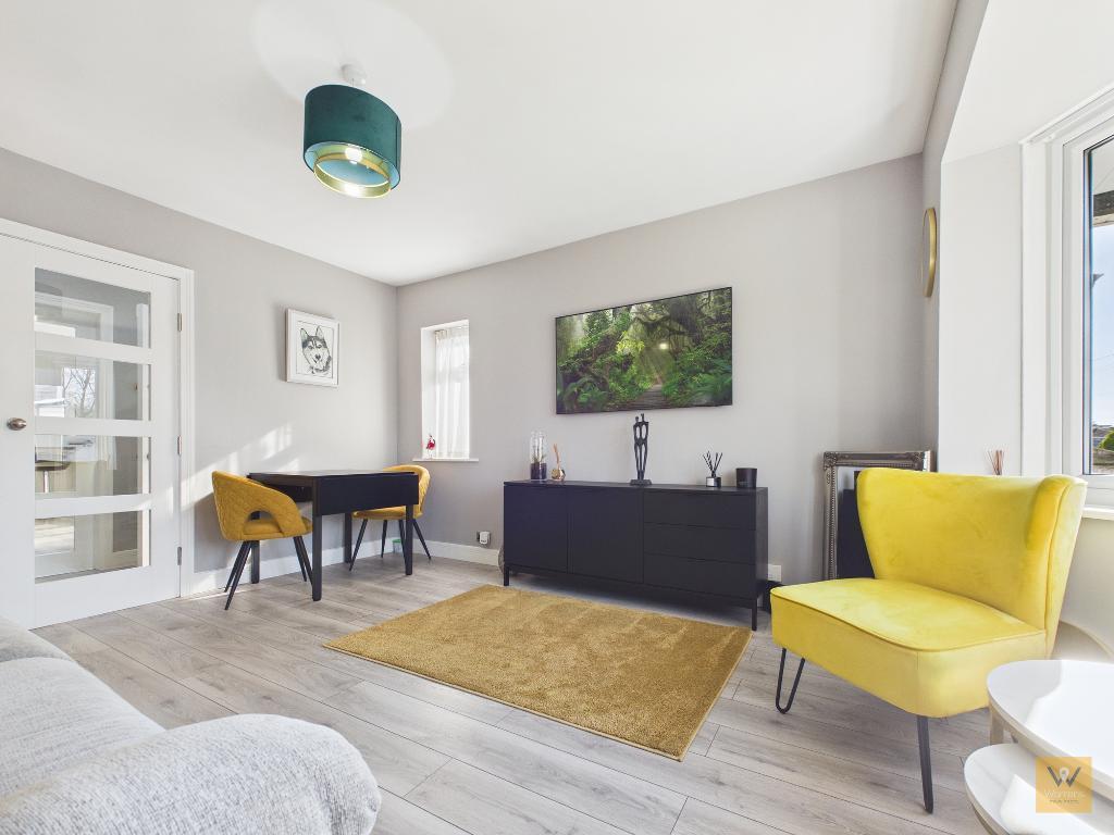 Double, contemporary style, glazed doors open into the living room. There is space, as you can see from the photographs, for a small dining table in this room. A rounded bay UPVC double glazed bay window to the front adds character to the room.