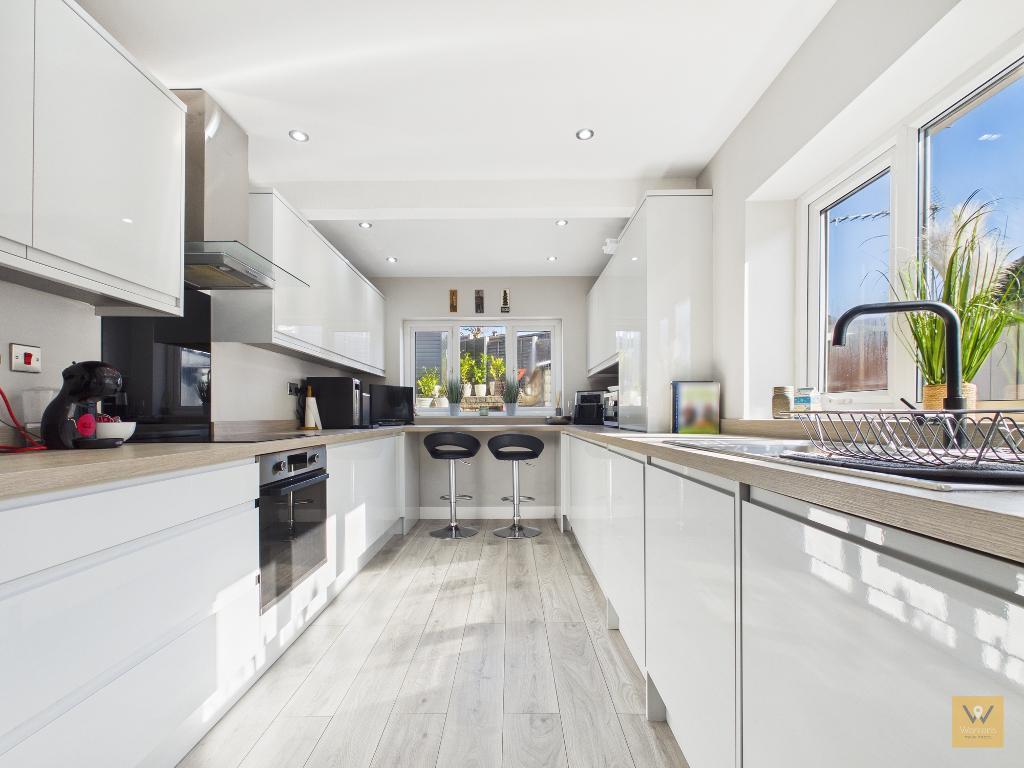 A stylish, newly fitted kitchen complete with a breakfast bar set under the rear window. The kitchen is fitted with a range of wall, base and drawer units. The kitchen features incorporated appliances a fridge, a freezer, a dishwasher, washing machine and built in electric oven and ceramic hob with an extractor over.