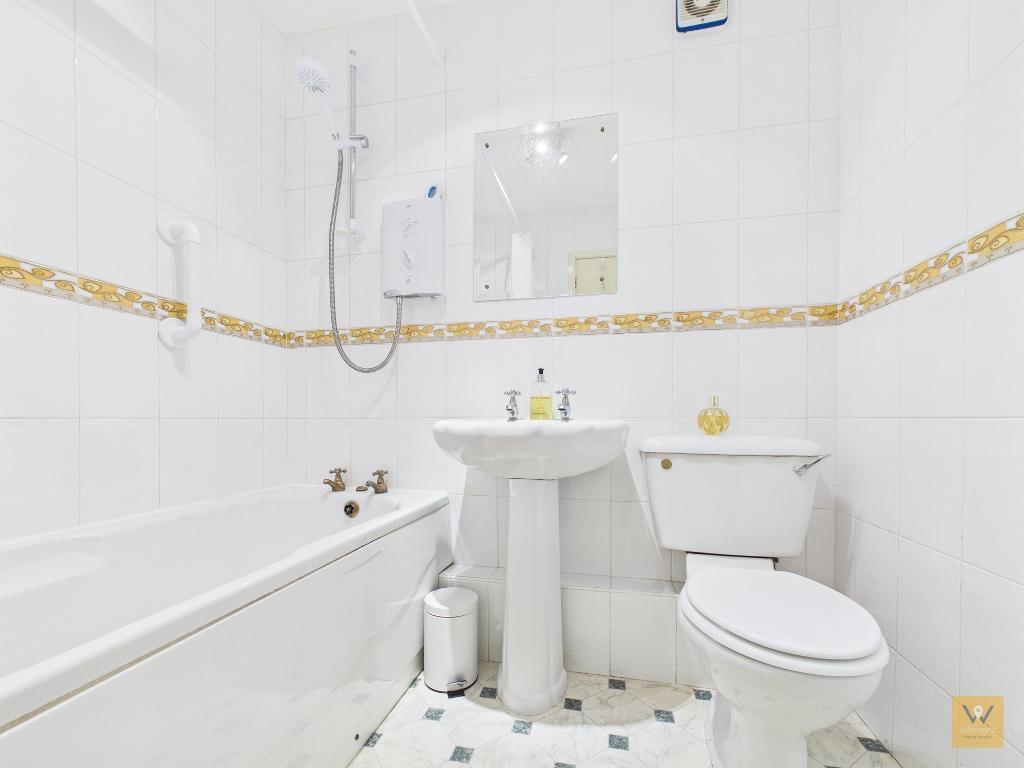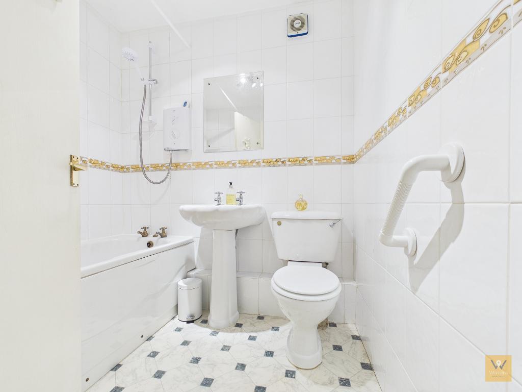 6' 5'' x 5' 8'' (1.98m x 1.75m) Fitted with a three piece suite comprising panelled bath with electric shower over, low level wc and a wash basin. Tiled walls. Vinyl flooring.