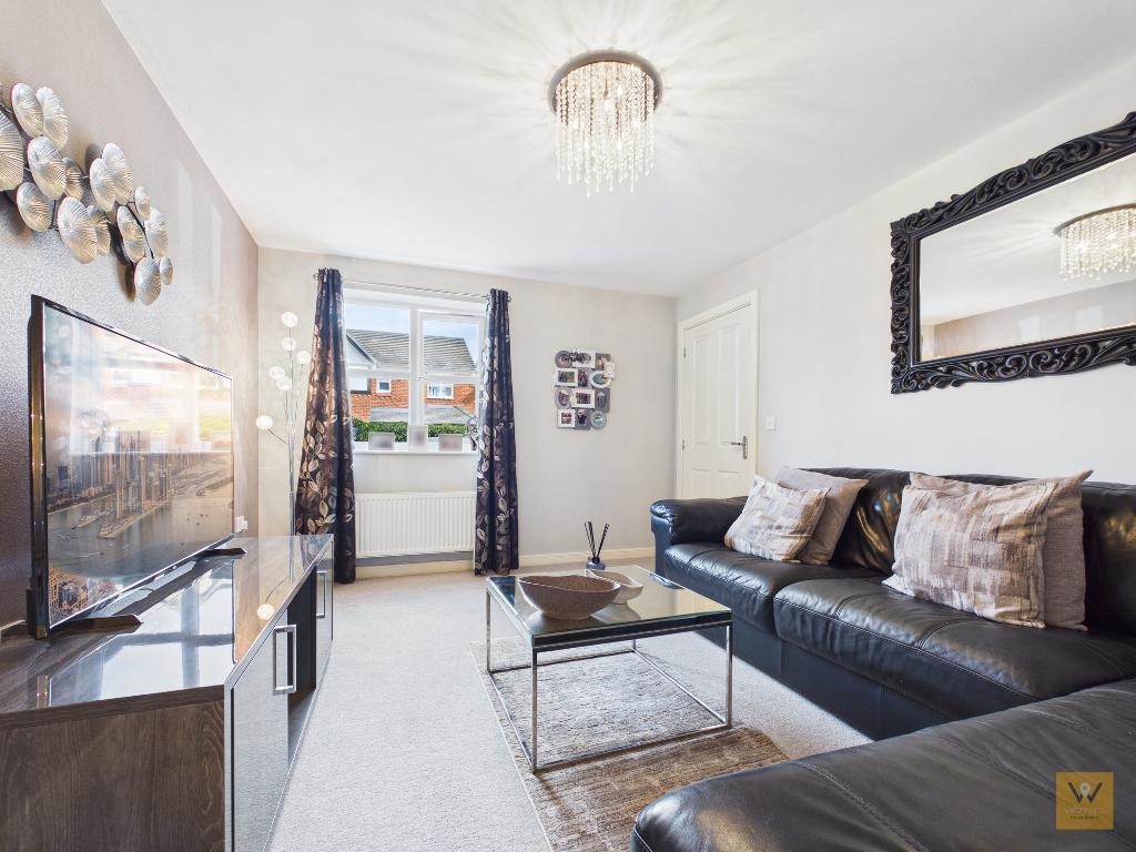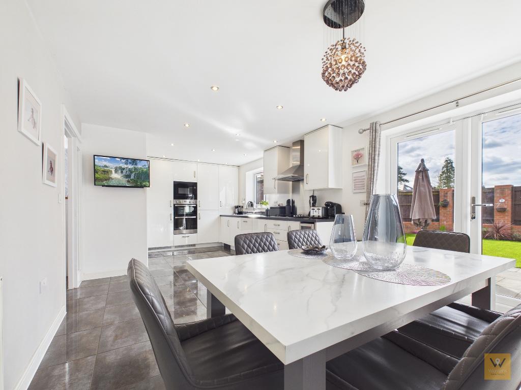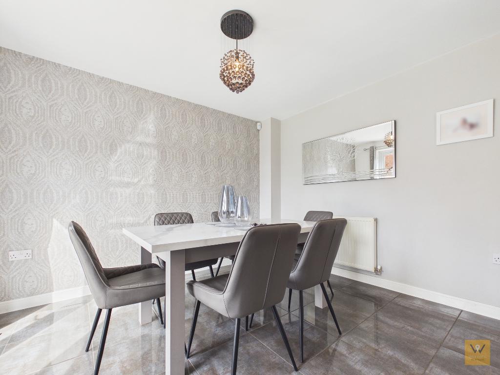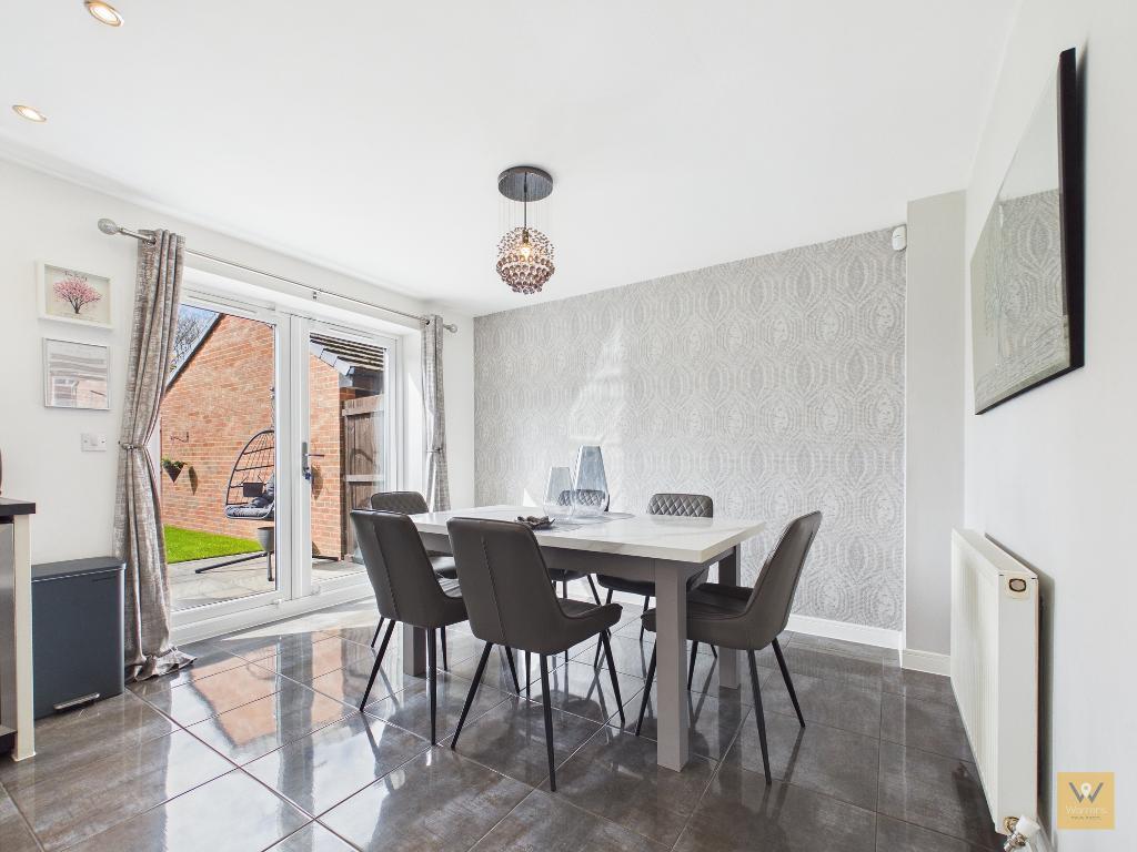 Step through the front door and you"ll be welcomed by a spacious, inviting hallway complete with an elegant turned staircase leading to the first floor. On one side, a flexible reception room offers endless possibilities; perfect as a media room, peaceful home office, or a cosy snug. On the opposite side is the generous and stylish living room, providing the ideal spot for relaxation. The contemporary open-plan dining kitchen is thoughtfully situated across the rear of the home, designed in a white high gloss finish that reflects light throughout the space. Modern, integrated appliances are already fitted, while a useful utility cupboard with plumbing for a washing machine is thoughtfully concealed for convenience. Patio doors open directly to the rear garden, creating a seamless connection to the outdoors; ideal for entertaining when social gatherings spill outside.