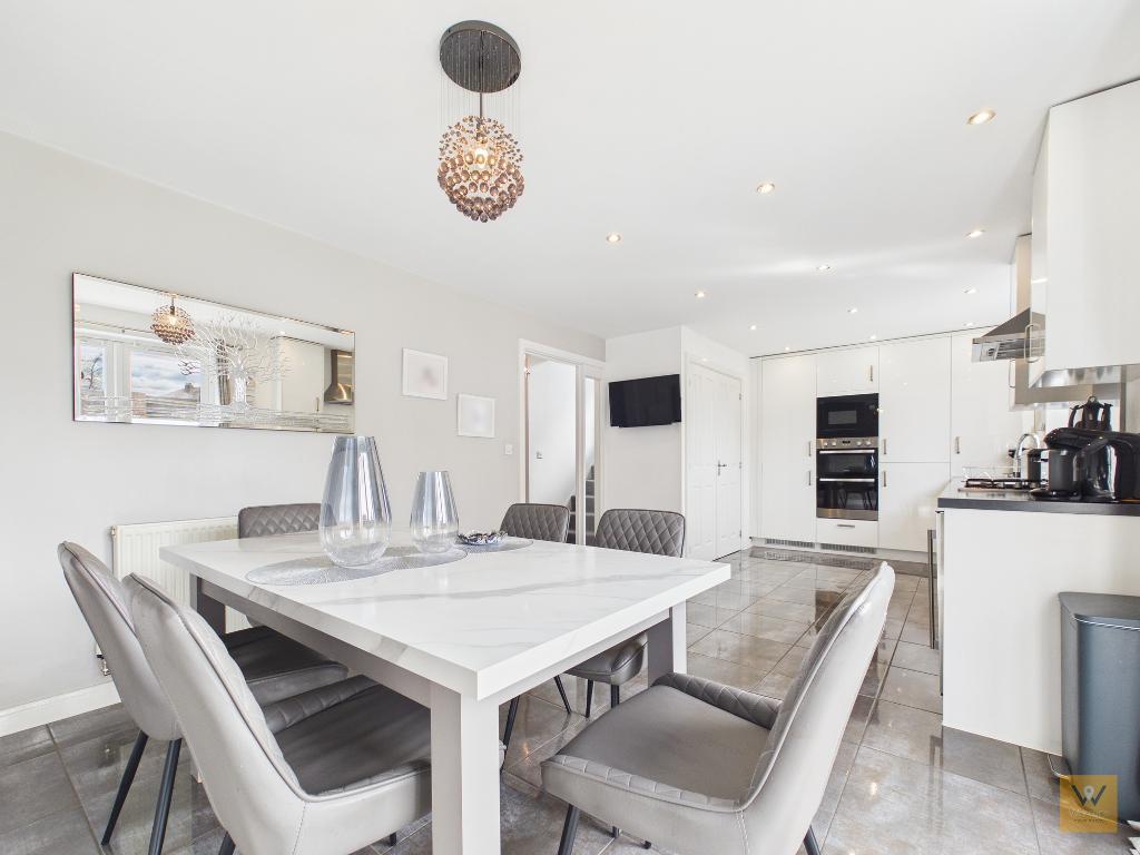 11' 3'' x 23' 3'' (3.45m x 7.1m) An open-plan dining kitchen with a tiled floor set against the white high gloss cabinetry. Wall, base and drawer units including a run of floor to ceiling units integrating the fridge and freezer and ovens along with additional storage space. Integrated dishwasher. Built in hob with an extractor over. Work surfaces. Integrated wine cooler. UPVC double glazed window to the rear. Space for a dining table. UPVC double doors opening to the rear garden. Utility cupboard with plumbing for a washing machine.
