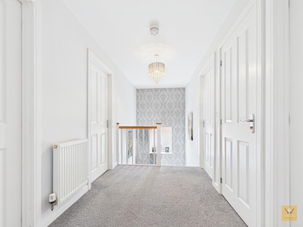 Upstairs, a naturally-lit galleried landing leads to four fitted double bedrooms; perfect for families seeking well proportioned space. The principal bedroom is particularly impressive, complete with its own en-suite shower room. A contemporary family bathroom serves the remaining bedrooms, creating balance and practicality for daily routines.