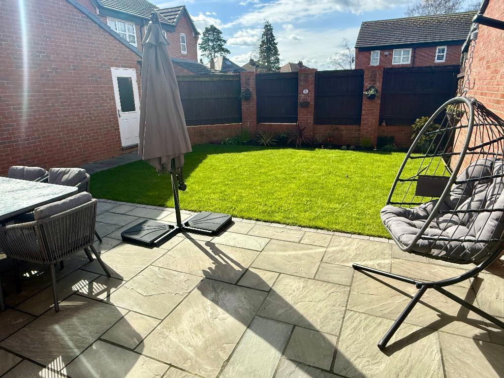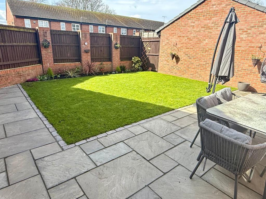 Outside, a manicured front garden frames the approach to this attractive home, while a lengthy private driveway extends alongside the house leading to a detached garage, offering ample parking and additional storage. To the rear, an Indian stone patio leads onto a well-kept lawned garden, creating the perfect sanctuary for summer barbecues or simply unwinding.