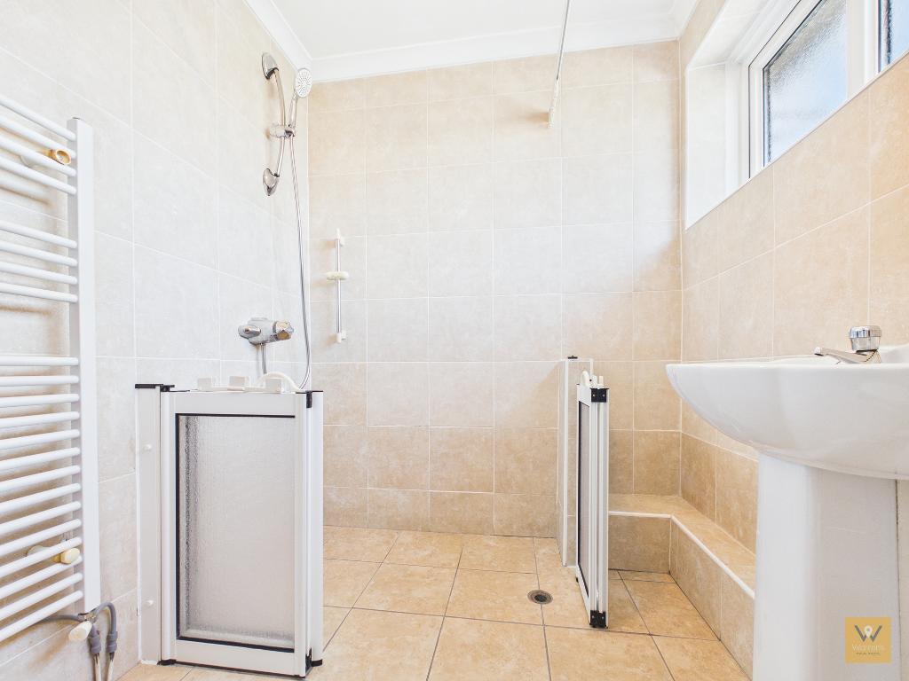 7' 1'' x 5' 10'' (2.16m x 1.78m) Fitted with a walk in shower, low level wc and a wash basin. Tiled floor and walls. Heated towel rail. Double glazed window to the front aspect.