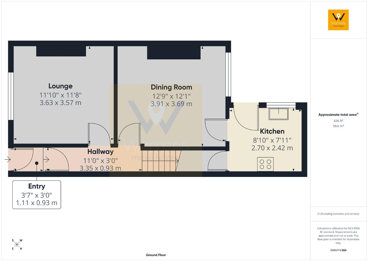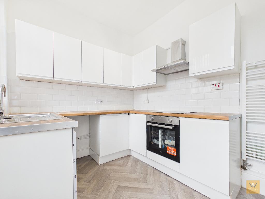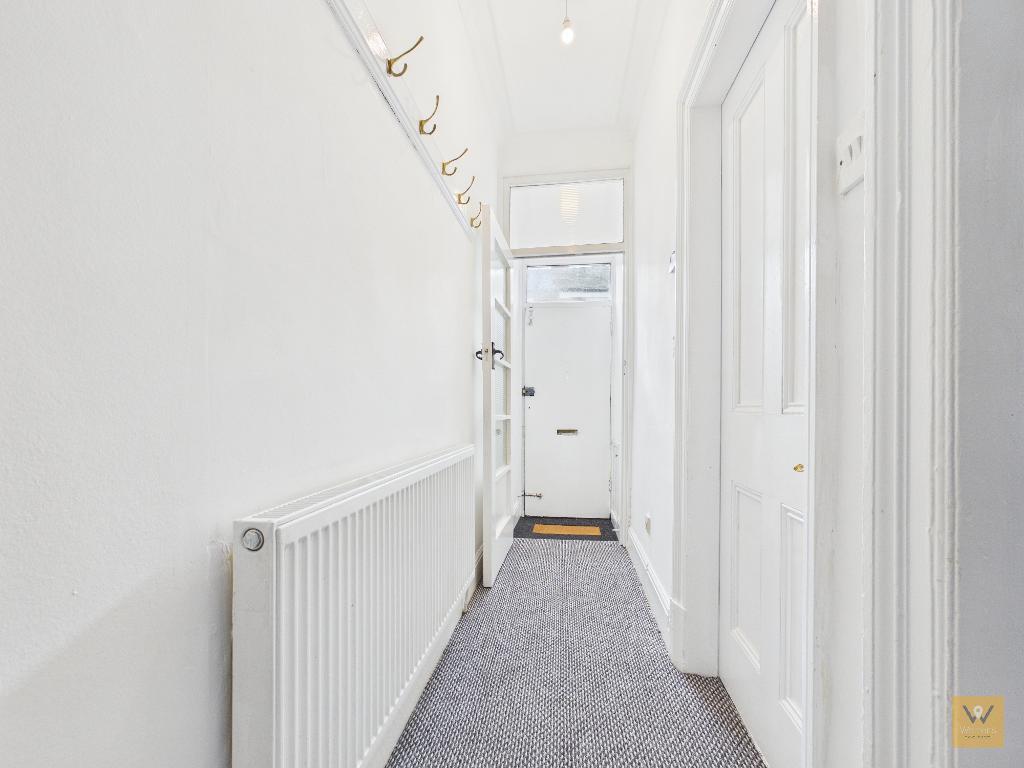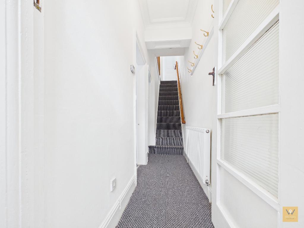 Walk up the path and cross the threshold where you are greeted by an entrance hall. Stairs ascend ahead. To your left, there are two doors. The first door to the front opens into the living room to the front. The other door opens into the dining room beyond which is the newly fitted kitchen.