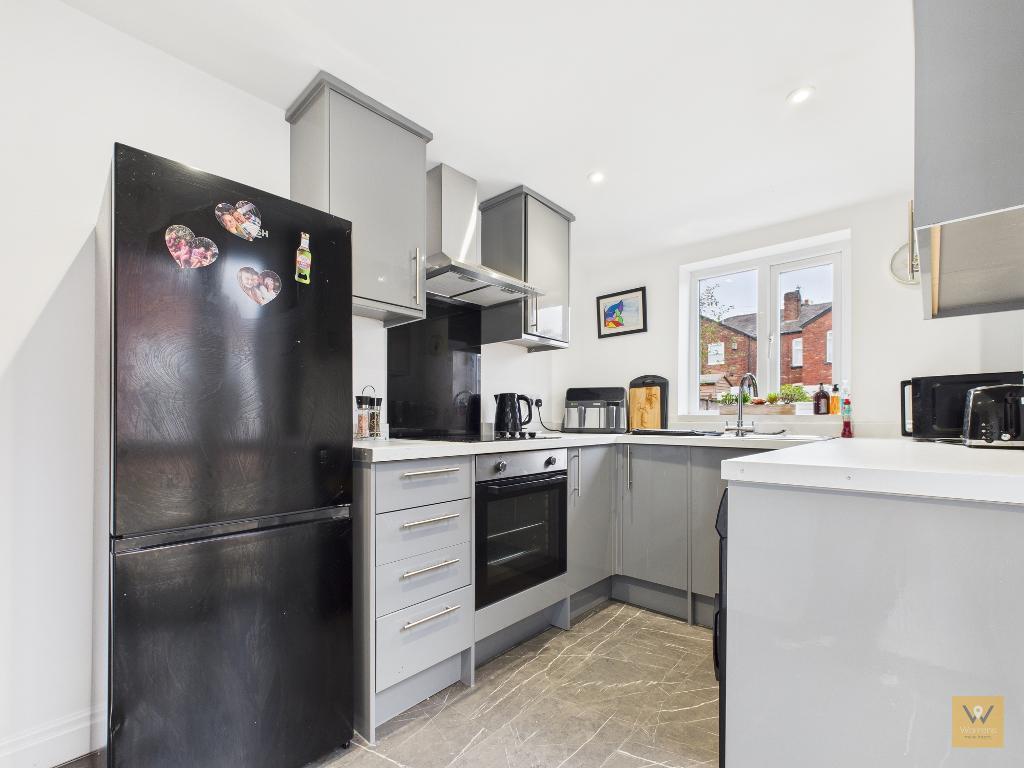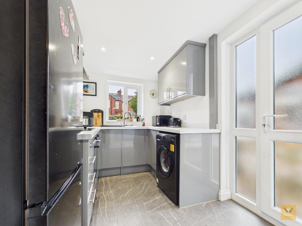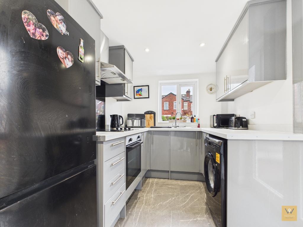 To the rear of the property there is a modern fitted kitchen with high gloss units and integrated oven and hob.