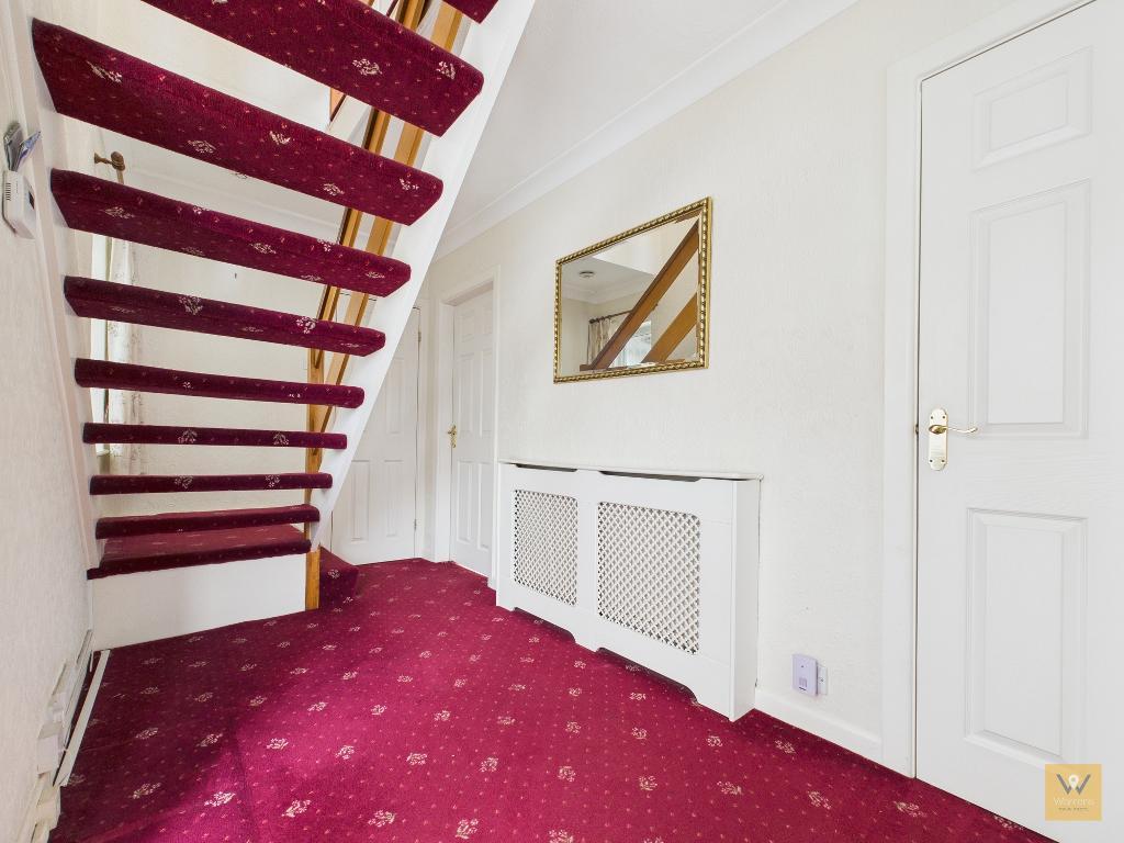 Radiator. Stairs to the first floor. Door to the living room. Door to the kitchen (to the front). Door to the downstairs w.c. Storage cupboard.