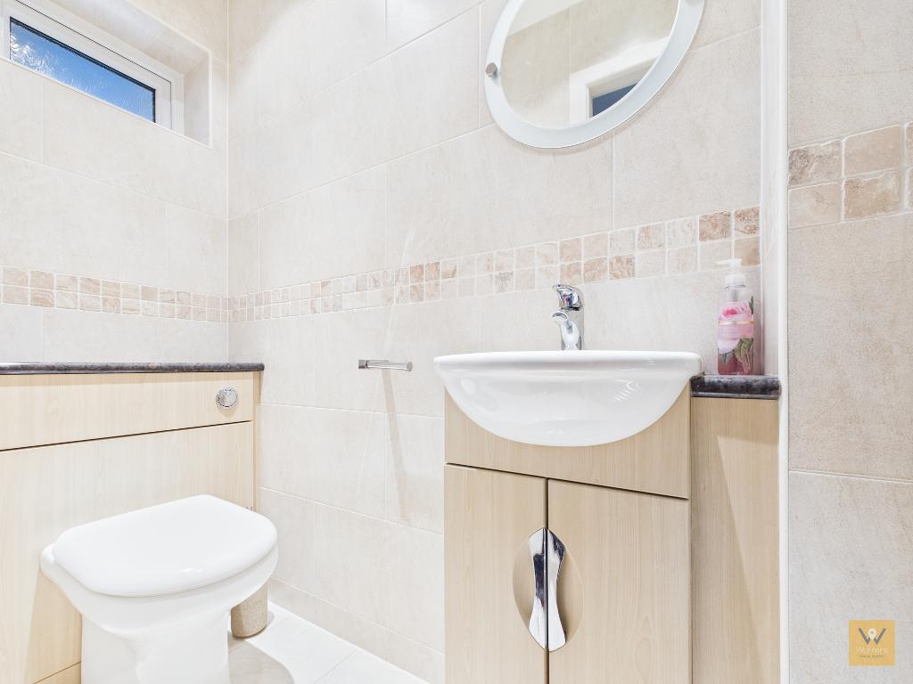 2' 7'' x 6' 0'' (0.79m x 1.85m) A contemporary styled downstairs w.c. with a low level w.c. and a wash hand basin. Chrome effect heated towel rail. Fully tiled walls. UPVC double glazed window to the side.