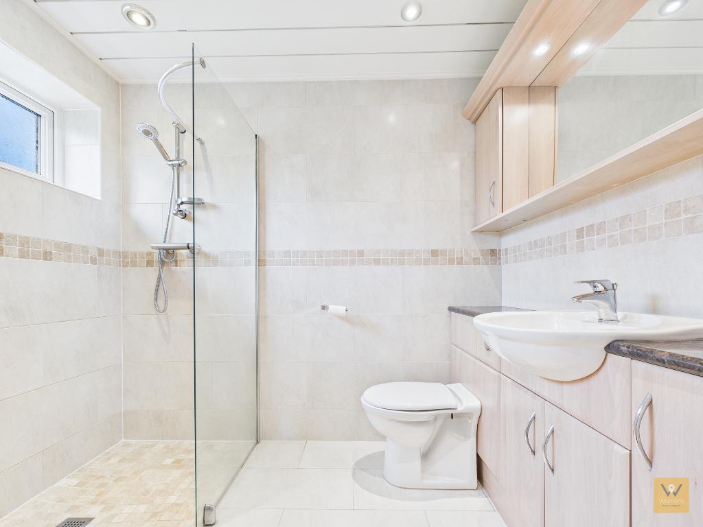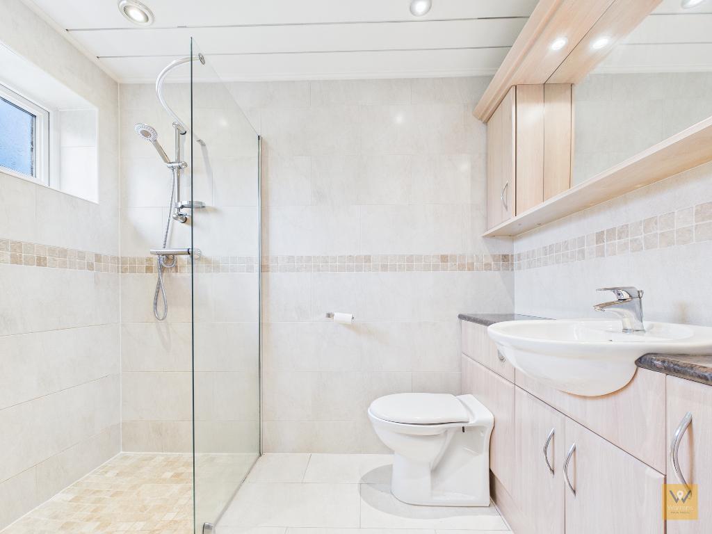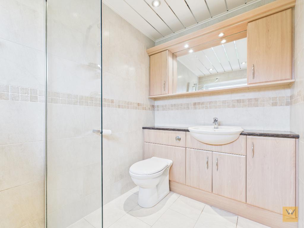 5' 4'' x 7' 11'' (1.64m x 2.42m) A fully tiled stylish shower room/w.c. Shower cubicle, chrome effect heated towel rail, low level w.c and a wash hand basin (housed in a vanity unit). UPVC double glazed window to the rear.