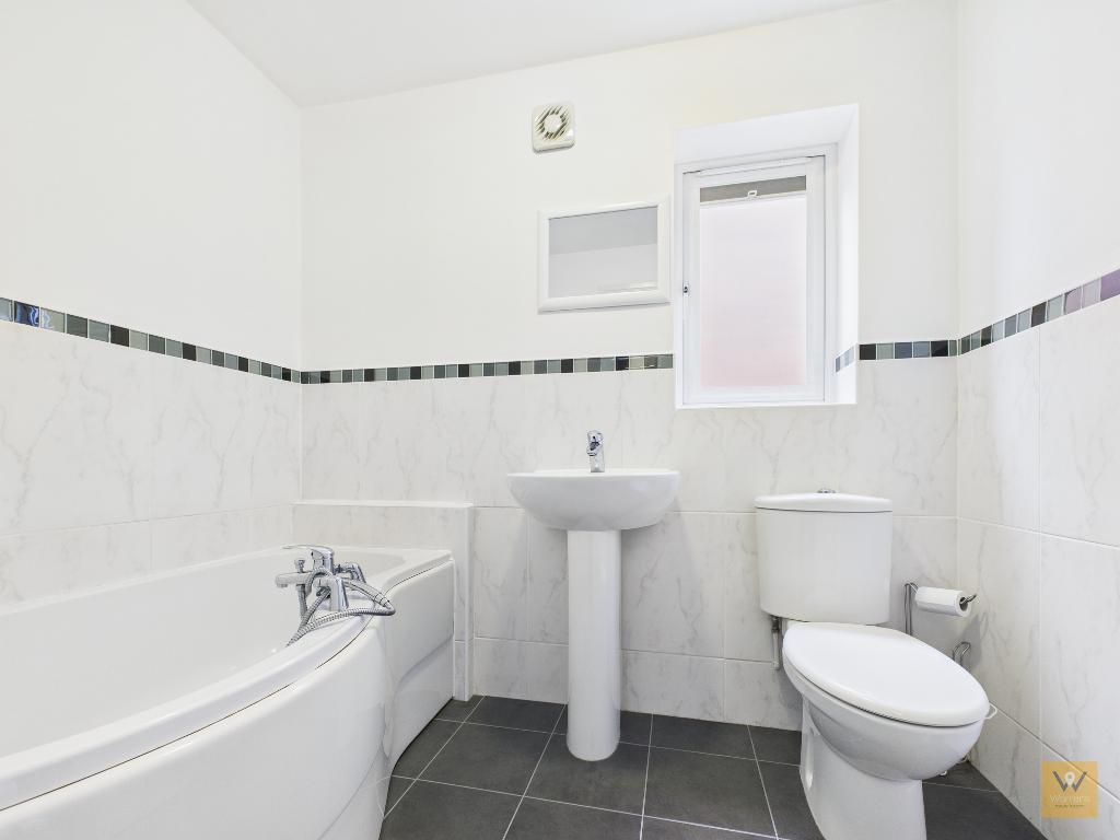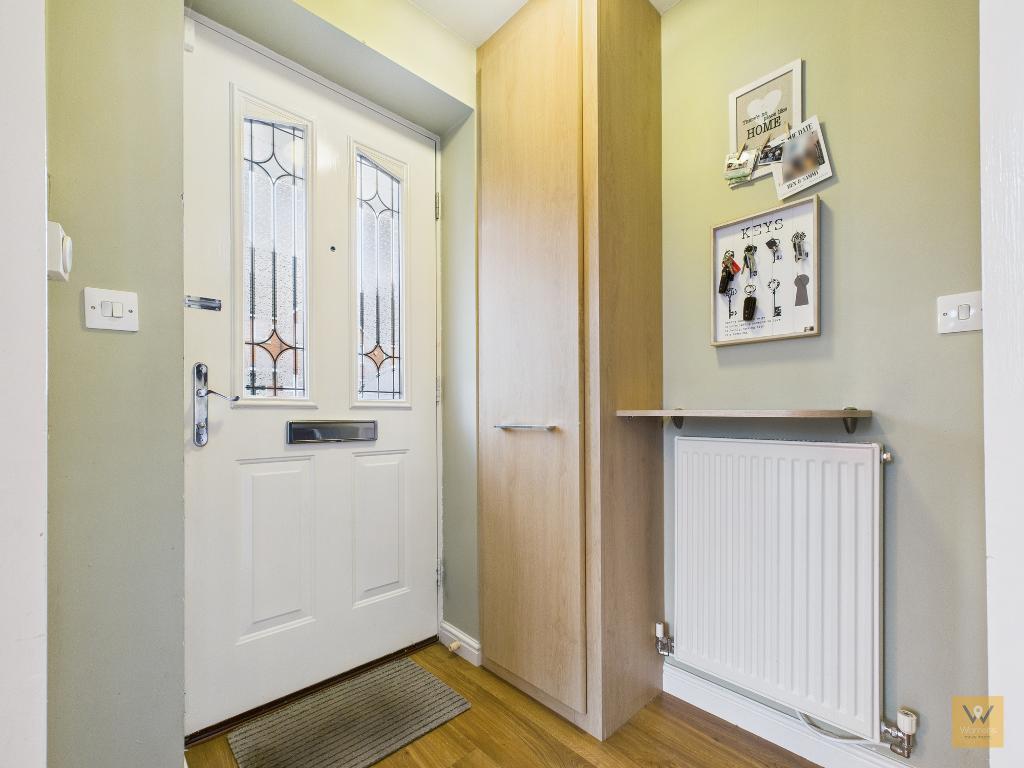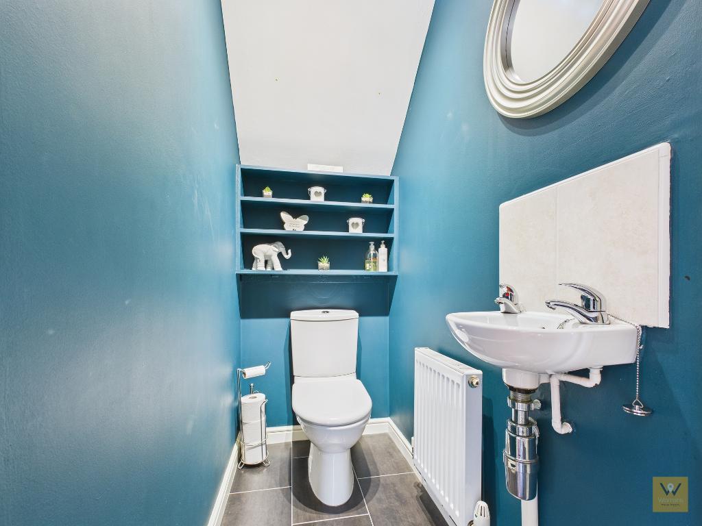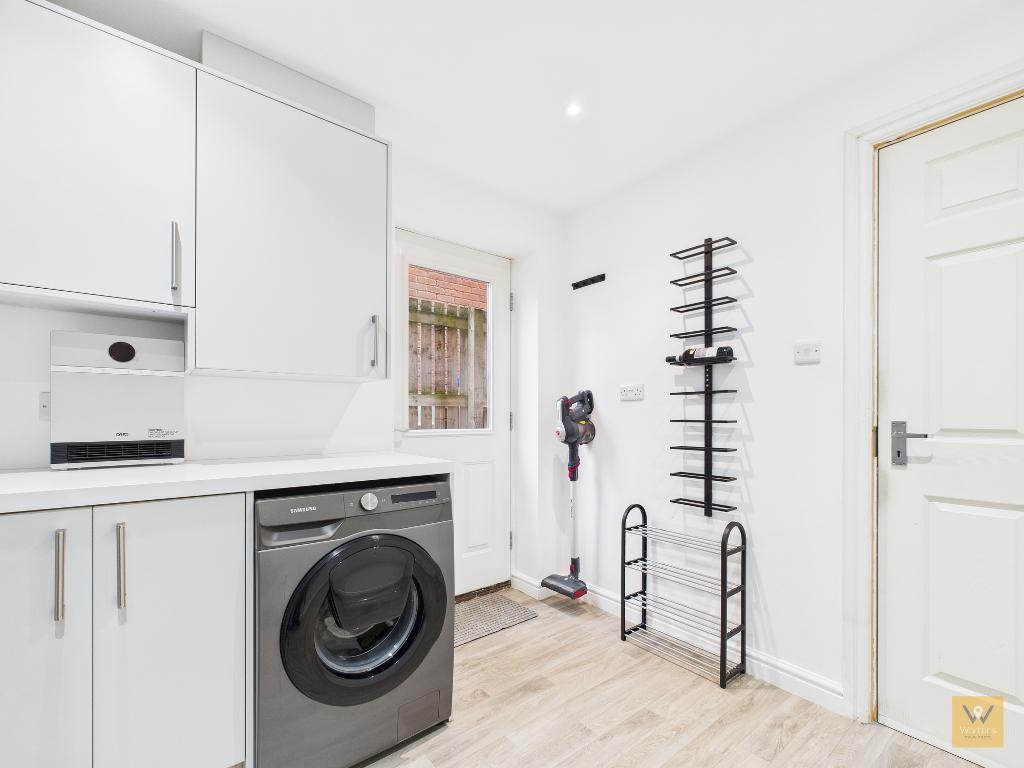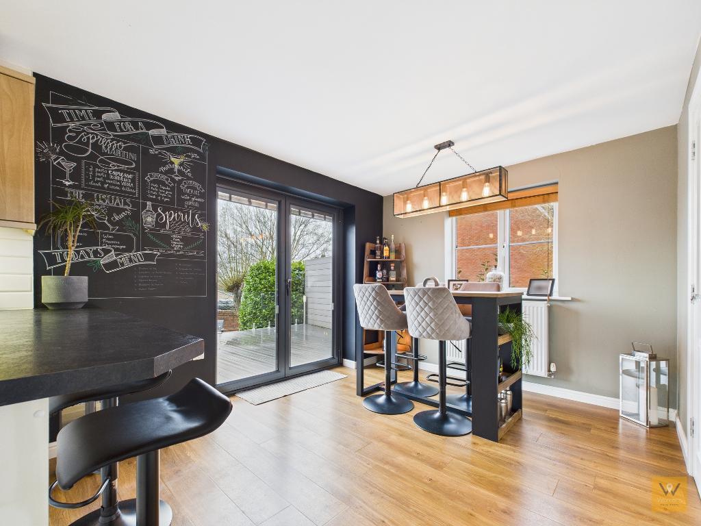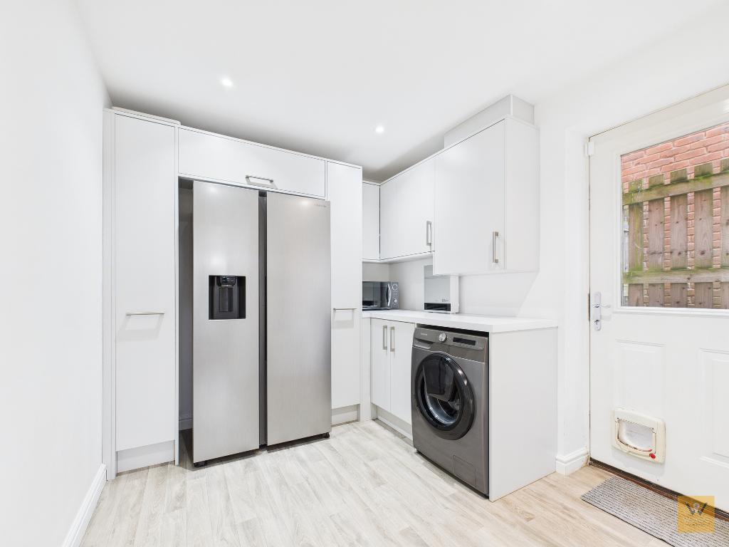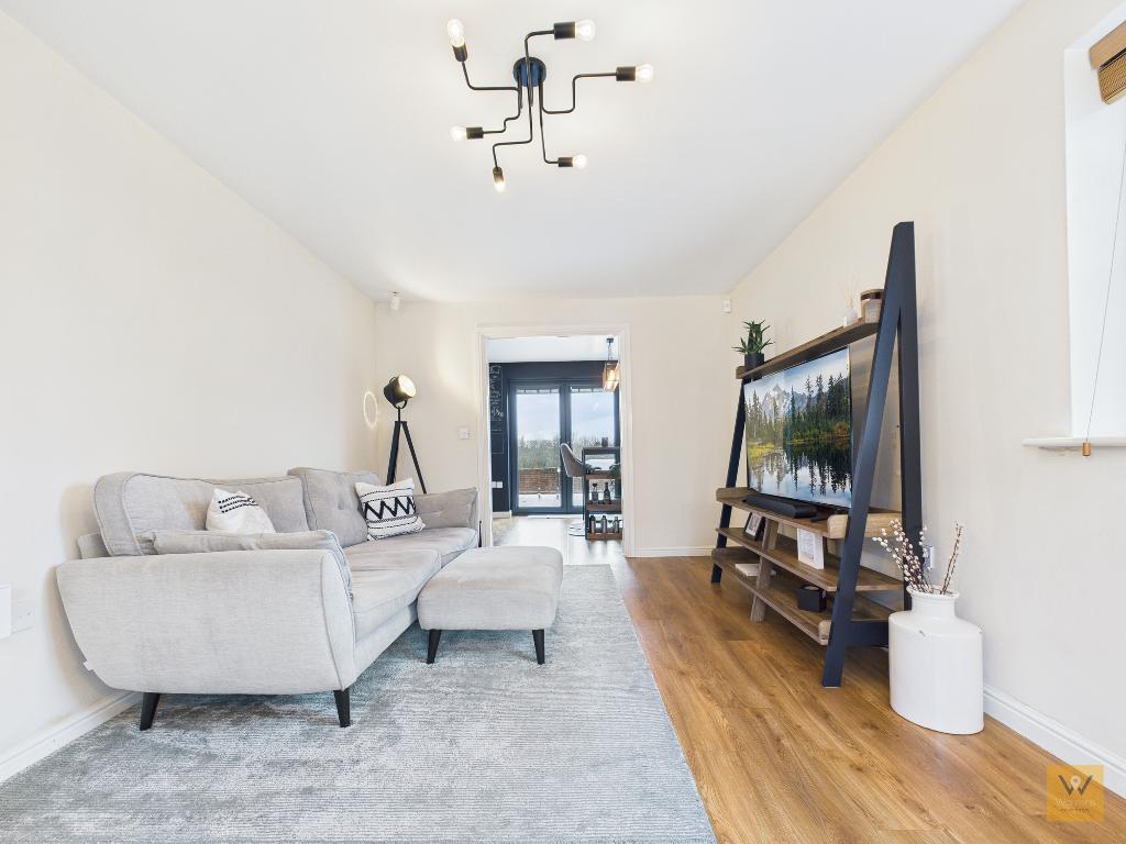 So, come in! Step inside to the entrance vestibule. A door opens to the living room, the laminate floor set off by the neutral decor. This room can be open, by way of double doors to the dining kitchen which spans the rear of the property. Sizable, light, airy and stylish this area will impress. A convenient downstairs W.C. adds to the family-friendly feel. Also off the kitchen, you will find a smart modern utility room which houses the large fridge freezer and washing machine.