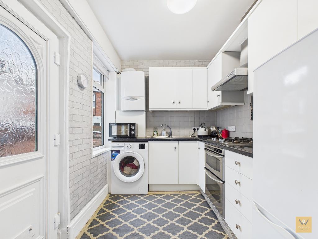 8' 7'' x 6' 10'' (2.62m x 2.11m) Fitted with a range of wall, drawer and base units with under unit lighting. Work surfaces incorporate a stainless steel sink and drainer. Integrated double oven with gas hob and extractor hood over. Spaces for a fridge freezer and washing machine. Tiled flooring and part tiled walls. Wall mounted 'combi' boiler. Double glazed window and door leading out to the rear garden.