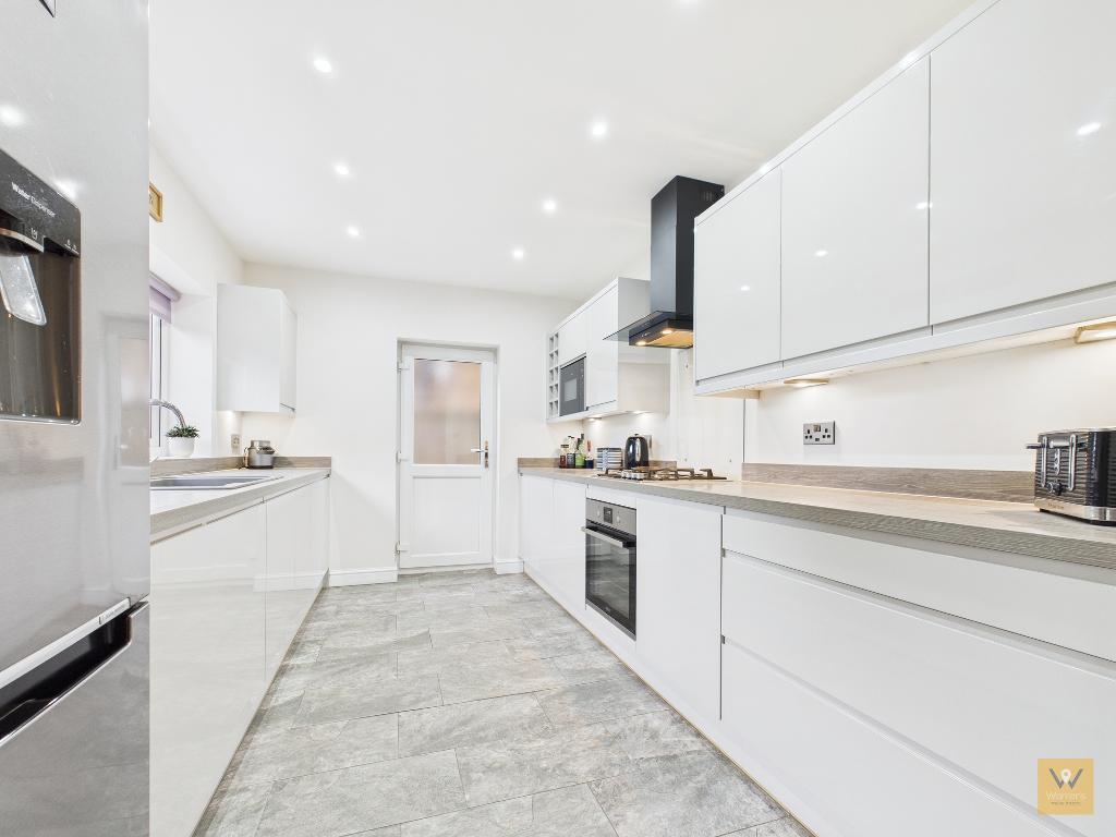 Fitted with wall, base and drawer units with sleek high gloss doors. Single drainer sink unit set in the work surface beneath the UPVC double glazed window; a pleasant vista when doing the dishes! There is an integrated dishwasher too. Space for a tall fridge freezer.