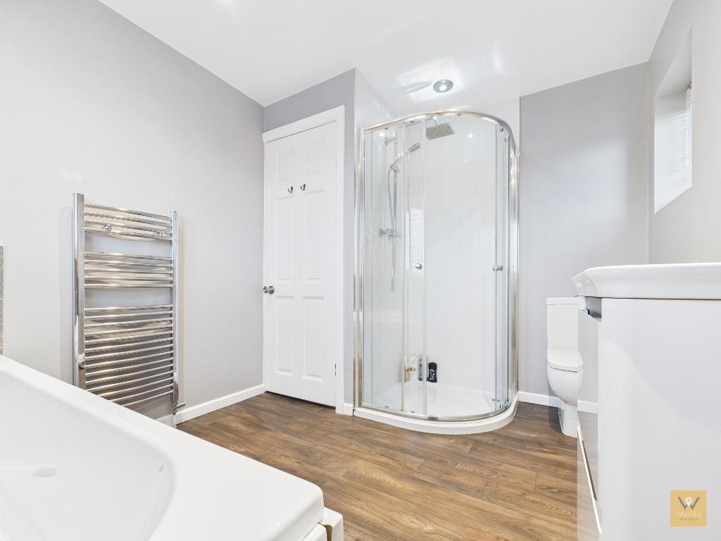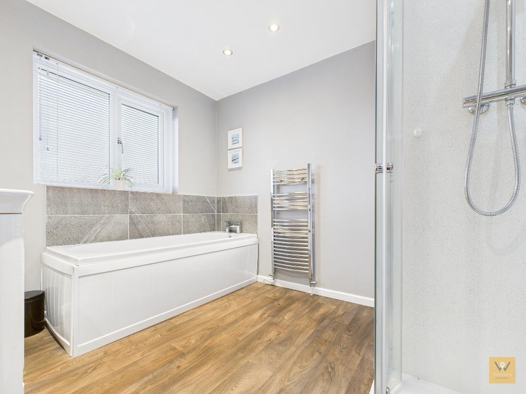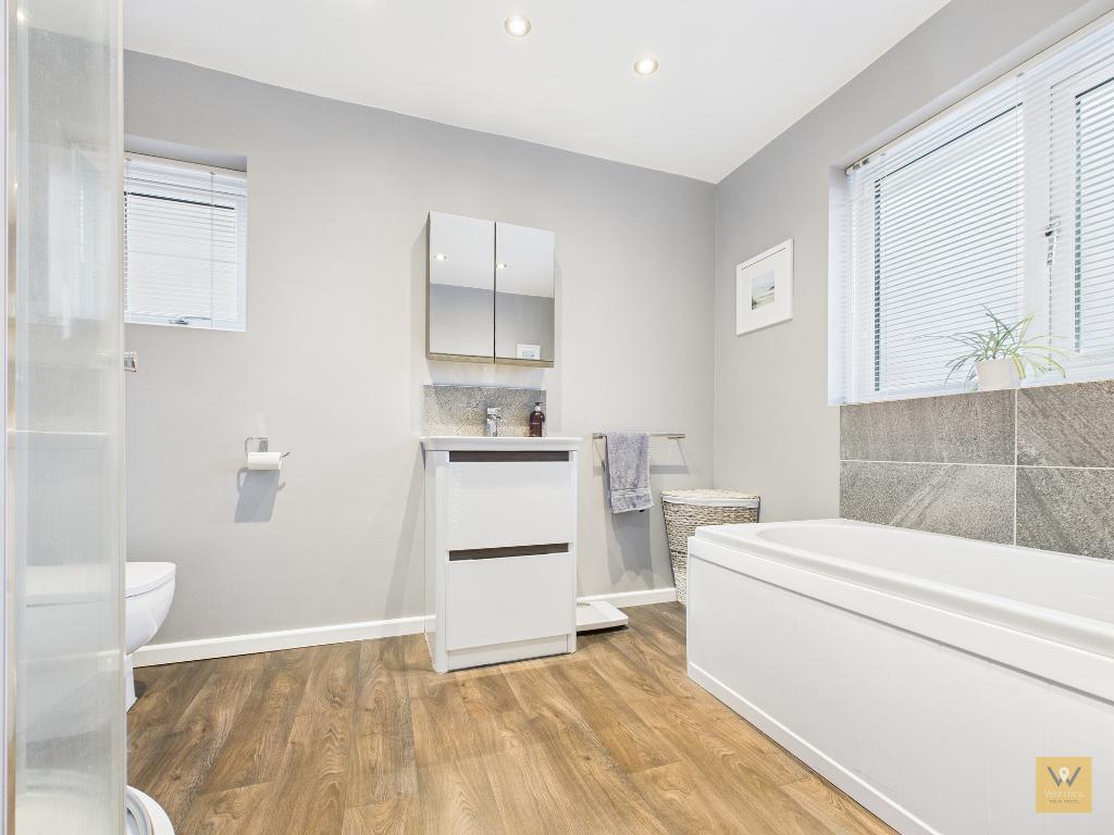 8' 2'' x 9' 10'' (2.51m x 3.02m) Fitted with a modern four piece suite comprising panelled bath, separate shower cubicle (with laminate aqua boarding), low level w.c., and a wash basin with vanity storage below. Chrome heated towel rail. Part tiled walls. Ceiling spotlights and extractor fan. Two double glazed frosted windows.