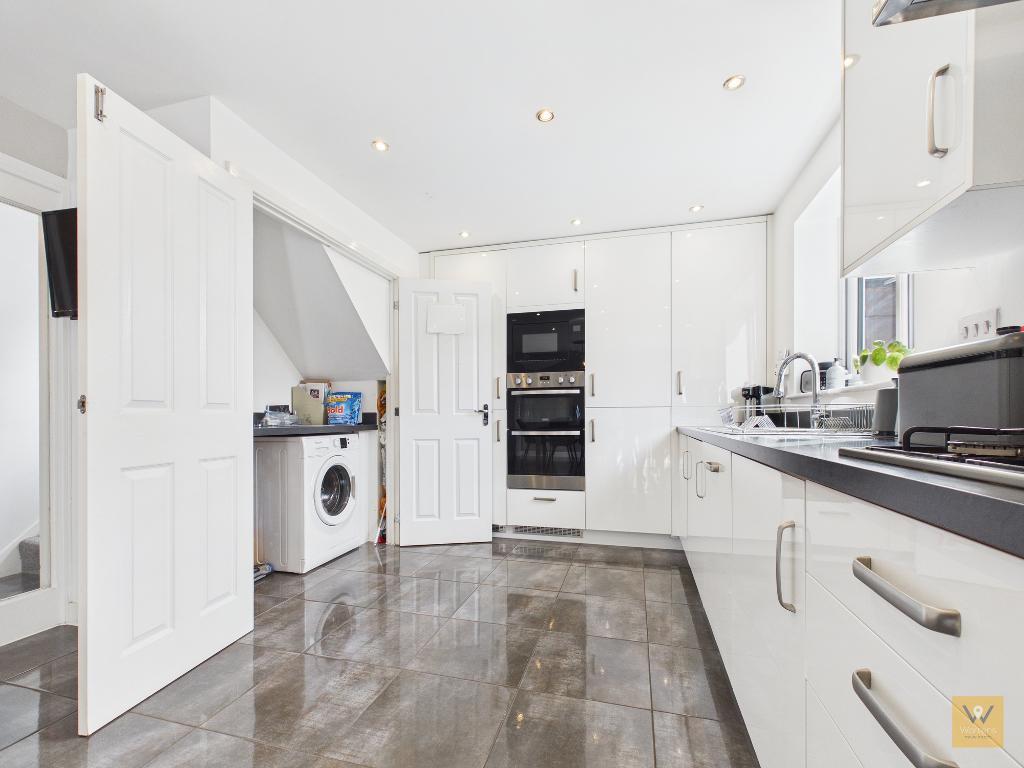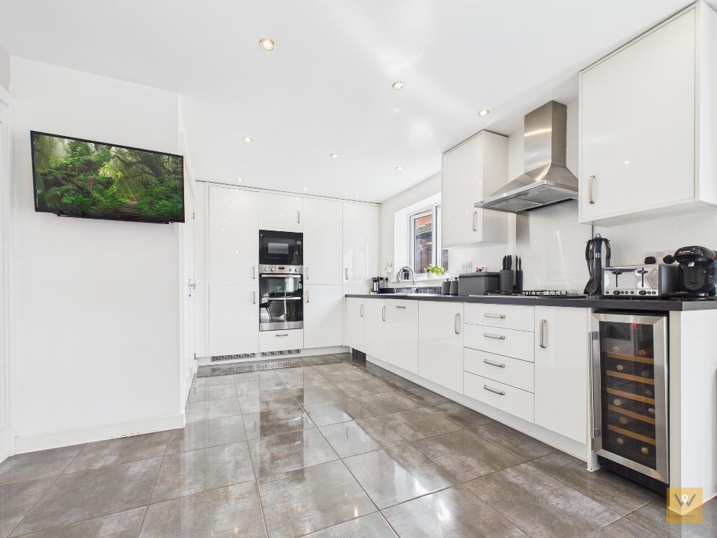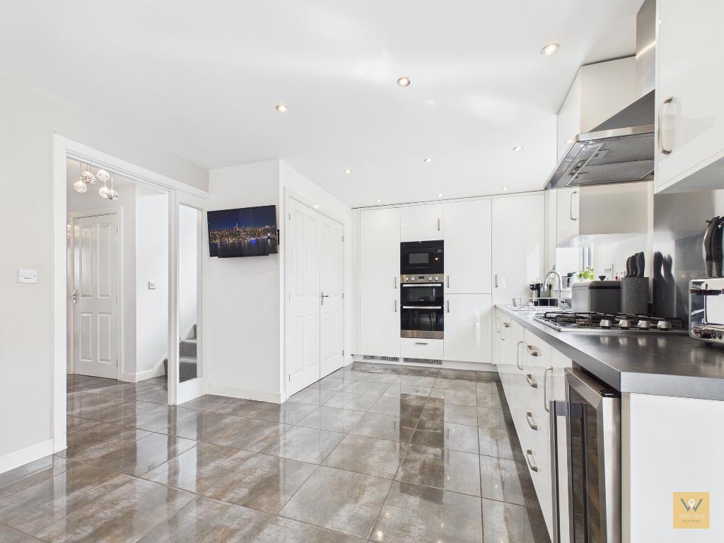 11' 3'' x 23' 3'' (3.45m x 7.1m) An open-plan dining kitchen with a tiled floor set against the white high gloss cabinetry. Wall, base and drawer units including a run of floor to ceiling units integrating the fridge and freezer and ovens along with additional storage space. Integrated dishwasher. Built in hob with an extractor over. Work surfaces. Integrated wine cooler. UPVC double glazed window to the rear. Space for a dining table. UPVC double doors opening to the rear garden. Utility cupboard with plumbing for a washing machine.