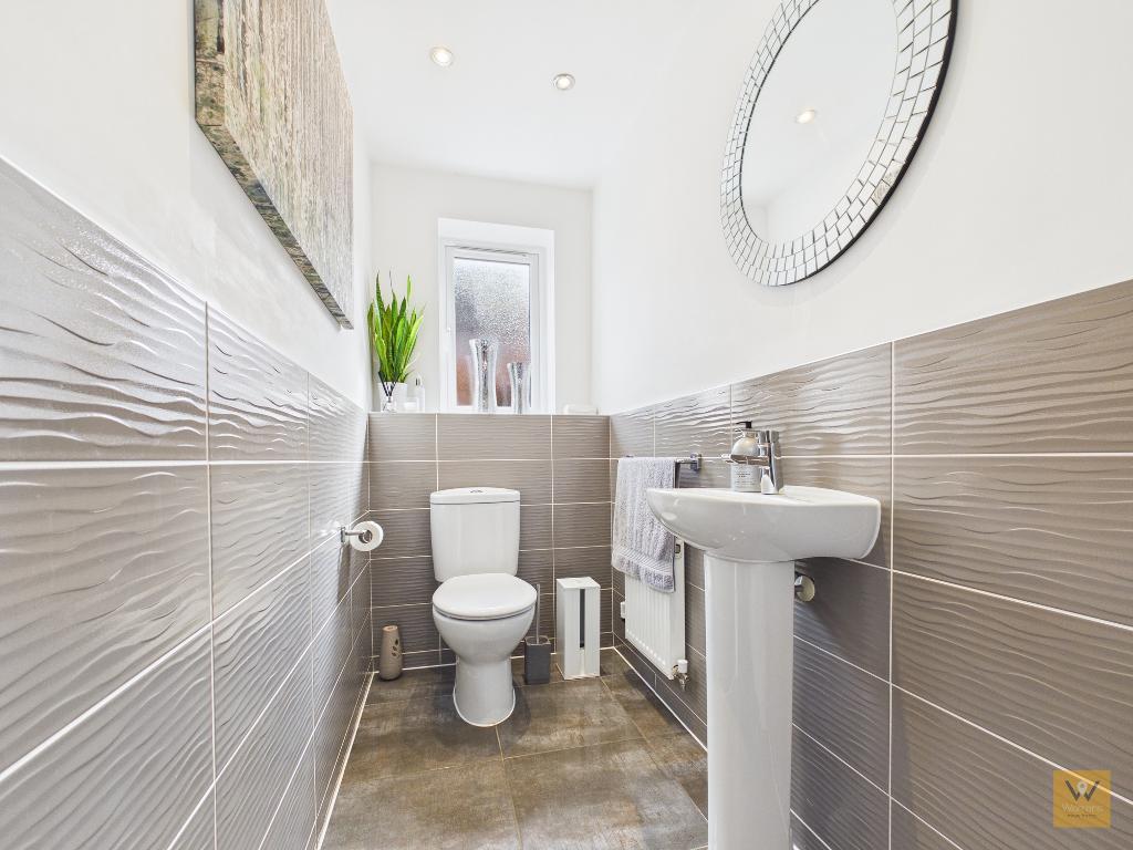 3' 7'' x 6' 6'' (1.1m x 2m) Part tiled walls. Low level W.C. Radiator. Wash hand basin. UPVC double glazed window to the side. Tiled floor.