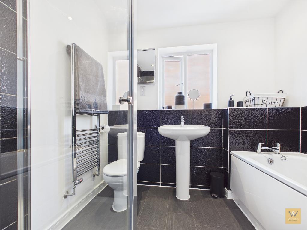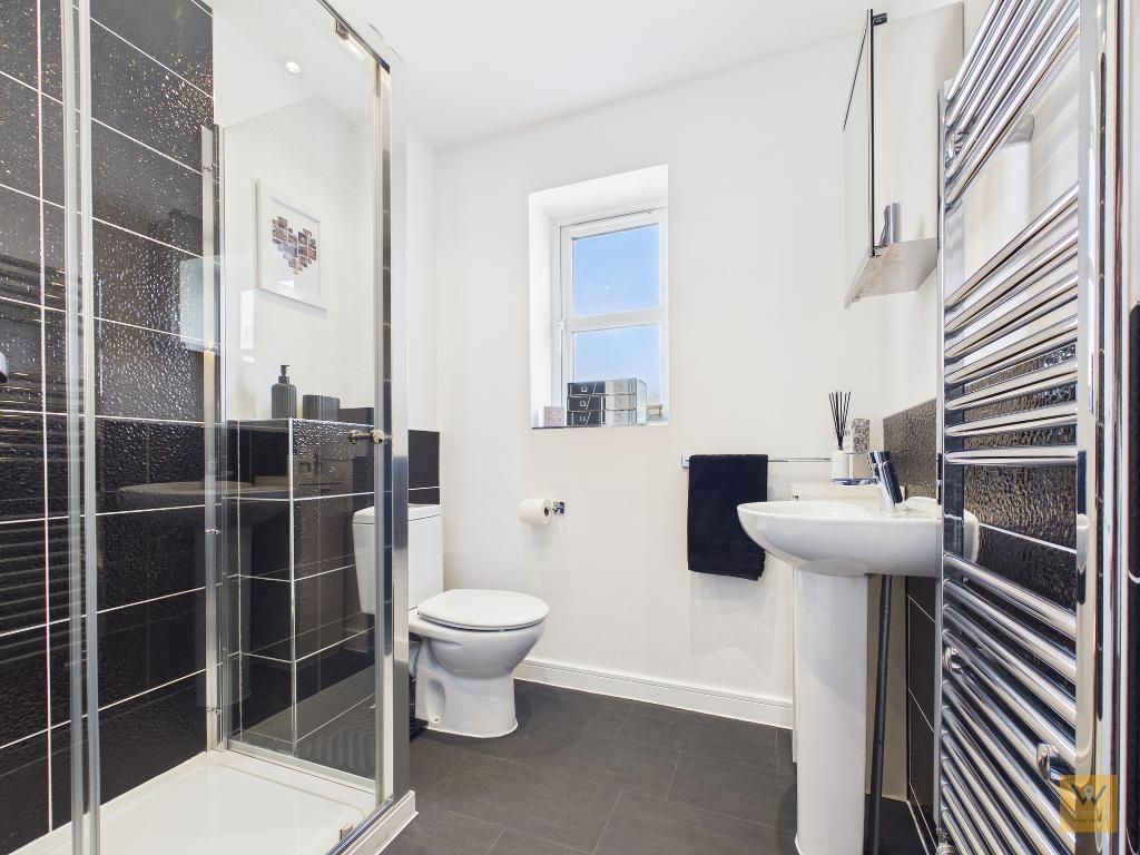 6' 7'' x 6' 5'' (2.03m x 1.97m) Fully tiled shower cubicle. Low level w.c. Wash hand basin. Part tiled walls. Chrome effect heated towel rail. UPVC double glazed window to the front.