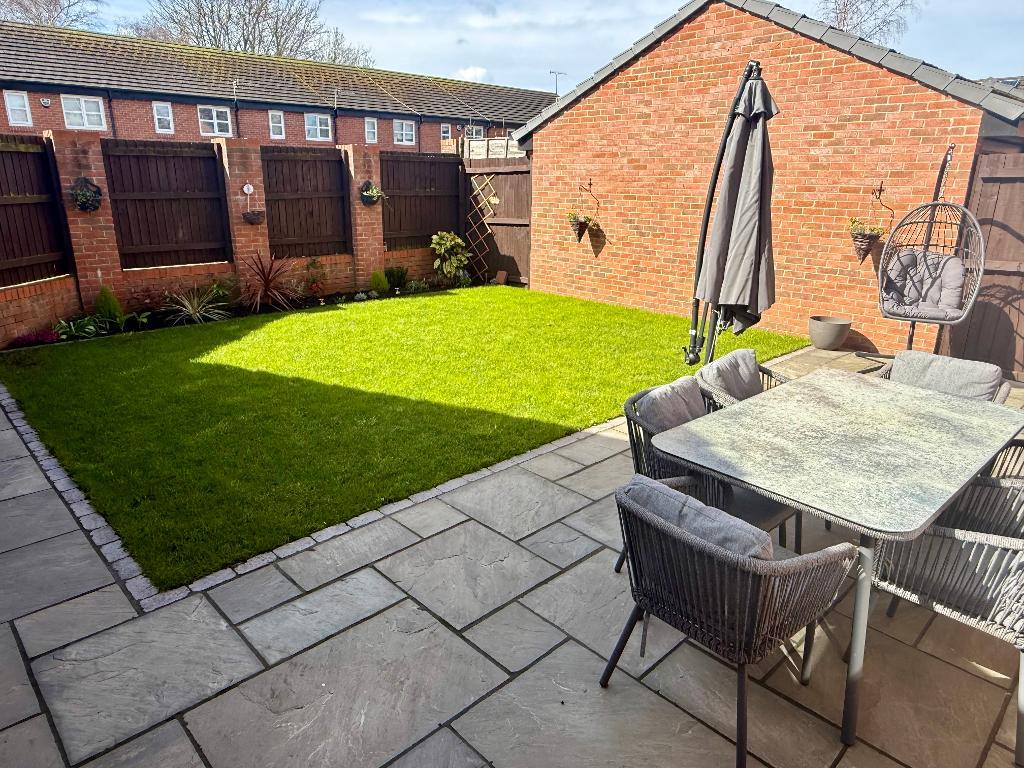 Outside, a manicured front garden frames the approach to this attractive home, while a lengthy private driveway extends alongside the house leading to a detached garage, offering ample parking and additional storage. To the rear, an Indian stone patio leads onto a well-kept lawned garden, creating the perfect sanctuary for summer barbecues or simply unwinding.