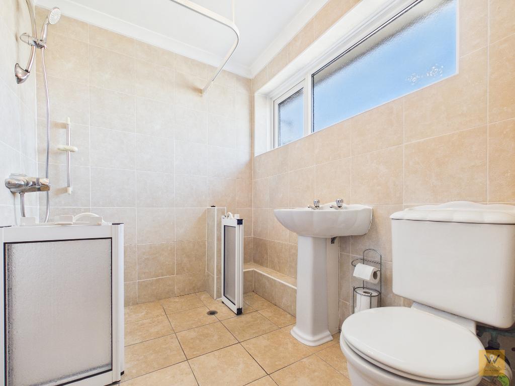 7' 1'' x 5' 10'' (2.16m x 1.78m) Fitted with a walk in shower, low level wc and a wash basin. Tiled floor and walls. Heated towel rail. Double glazed window to the front aspect.