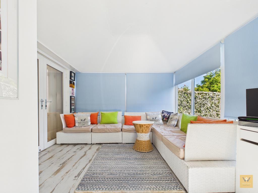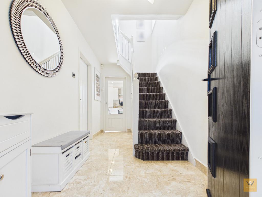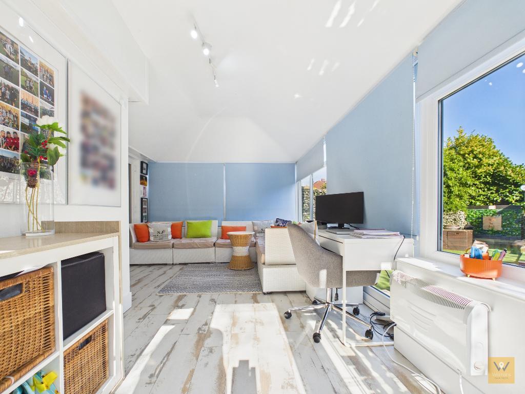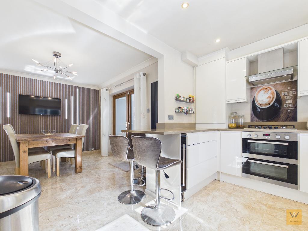 The kitchen, which is open to the dining area, offers similarly lovely presentation, featuring stylish cabinetry, integrated appliances including oven, hob, dishwasher and washing machine, and on-trend wood panelling with ambient lighting. Whether you"re rustling up a family meal or entertaining friends, this stylish heart of the home is ready for any occasion. From the kitchen and dining area, patio doors lead to the sun room at the rear;a bright, contemporary sanctuary boasting ample space and natural light, opening out seamlessly through a UPVC double glazed door to the idyllic rear garden.