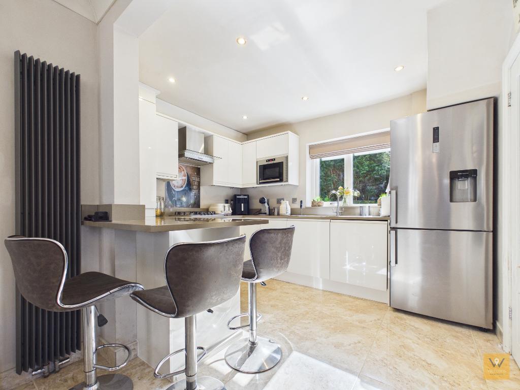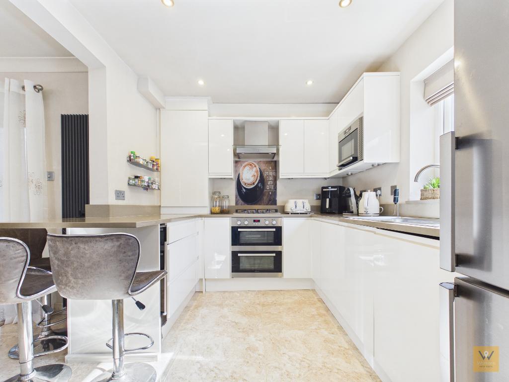 8' 3'' x 11' 1'' (2.53m x 3.4m) The kitchen is open to the dining room and comprises a range of white gloss wall, drawer and base units with granite worktops. Integrated double electric oven with gas hob and extractor hood over. Integrated microwave, washing machine, dishwasher and wine cooler. Space for a fridge freezer. Double glazed window to the side aspect.