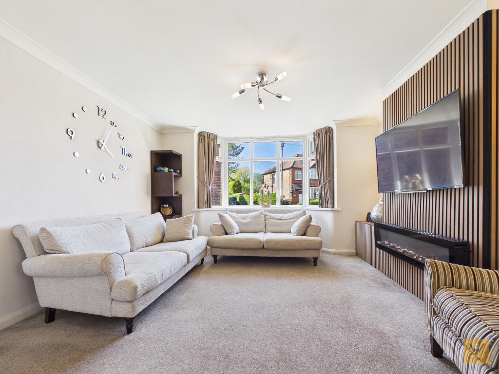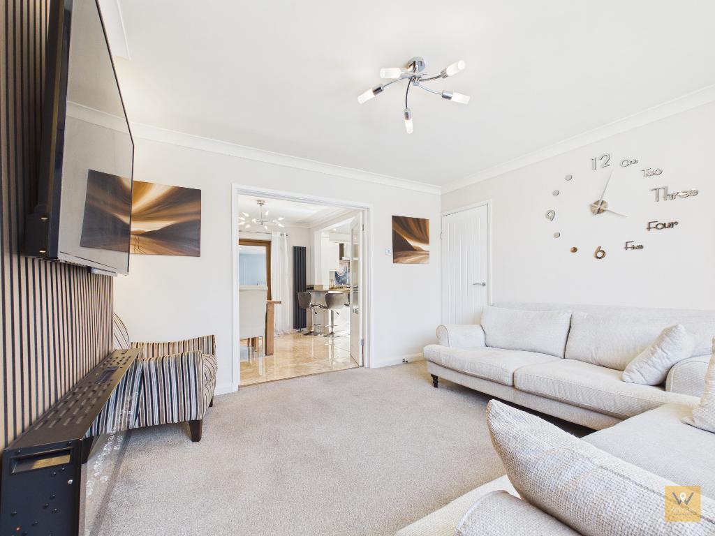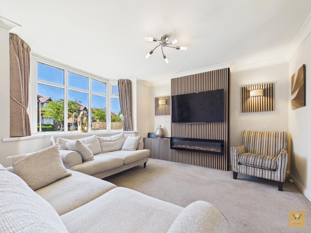 12' 10'' x 12' 11'' (3.93m x 3.94m) Double glazed bay window to the front aspect. Feature panelling to the fireplace wall. Electric fire. Two wall lights. Radiator. Ceiling coving. Double doors to dining kitchen as well as a door to the hallway.