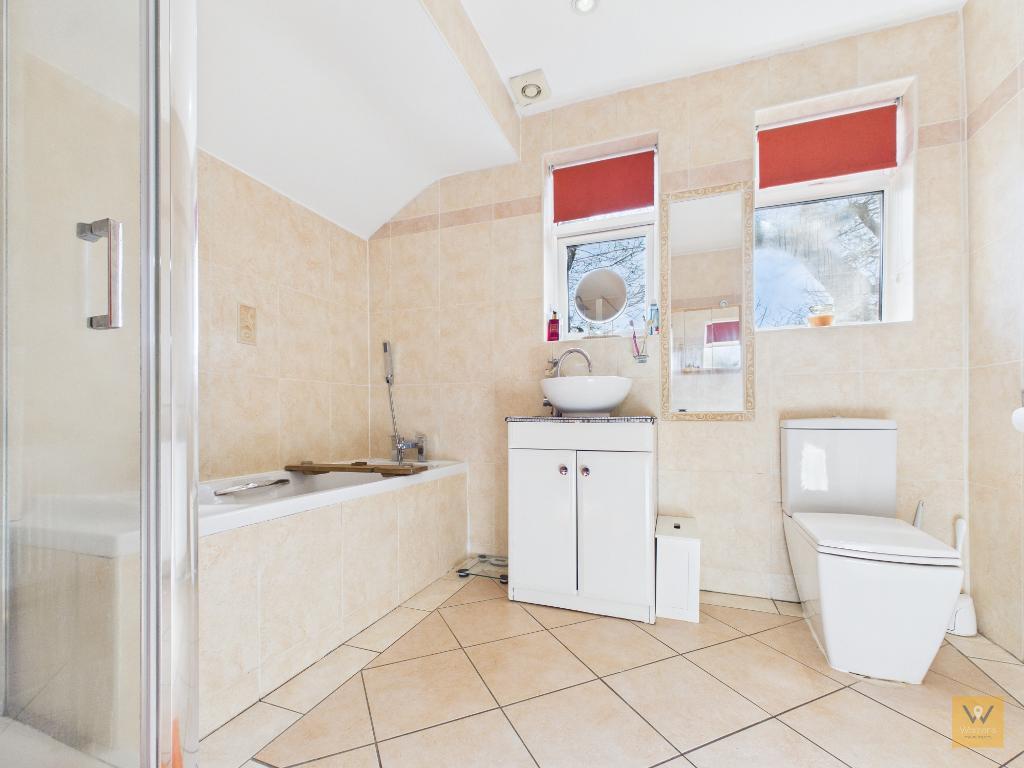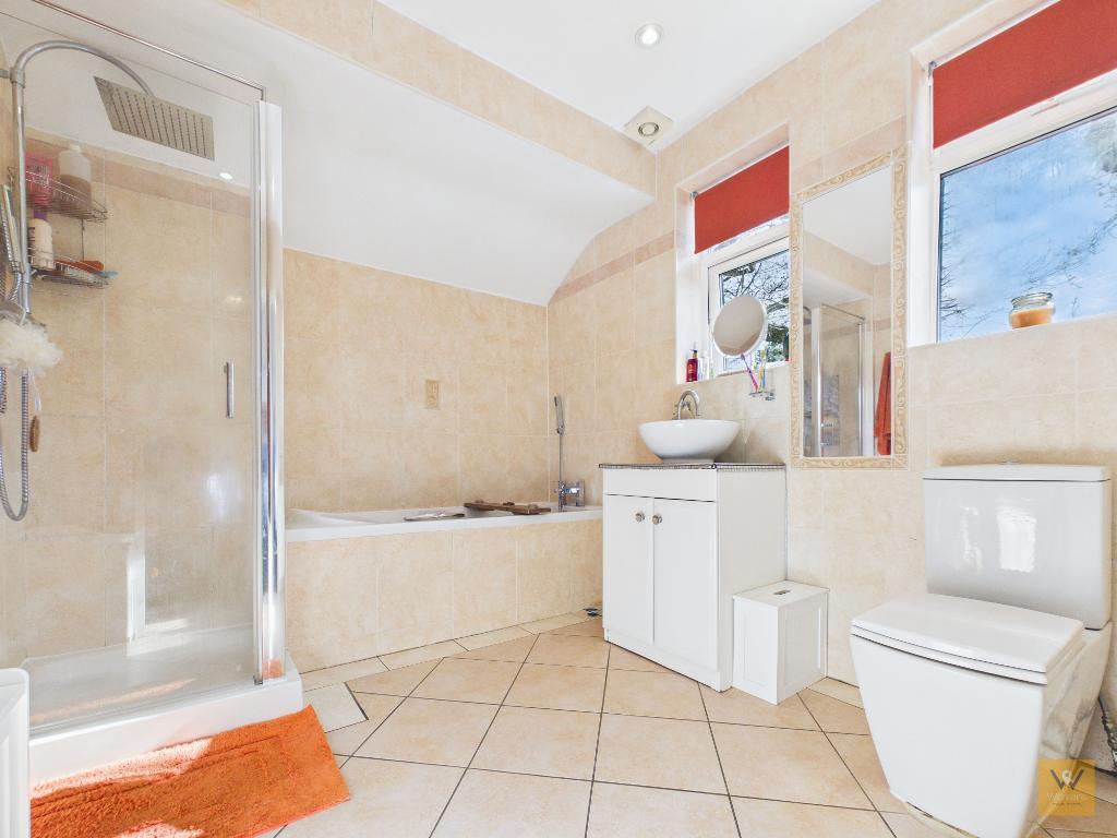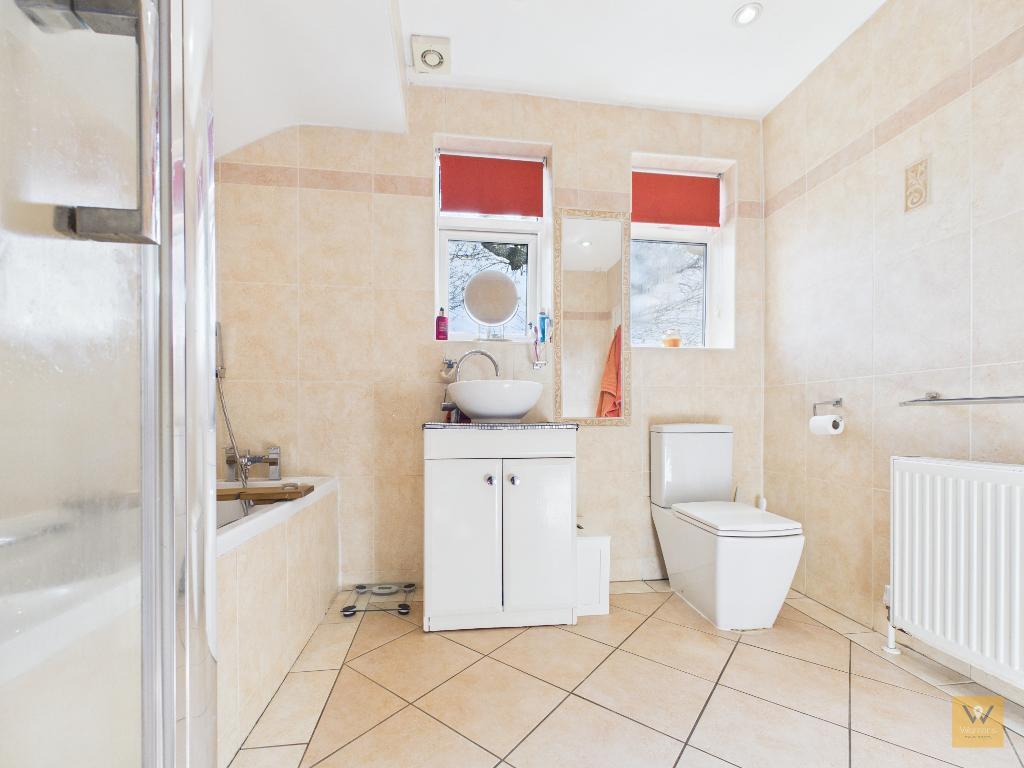 8' 3'' x 9' 5'' (2.52m x 2.88m) Fitted with a four piece suite comprising tiled bath, separate shower cubicle, low level wc and a wash basin with vanity storage below. Tiled floor and walls. Extractor fan. Two double glazed windows to the side elevation.